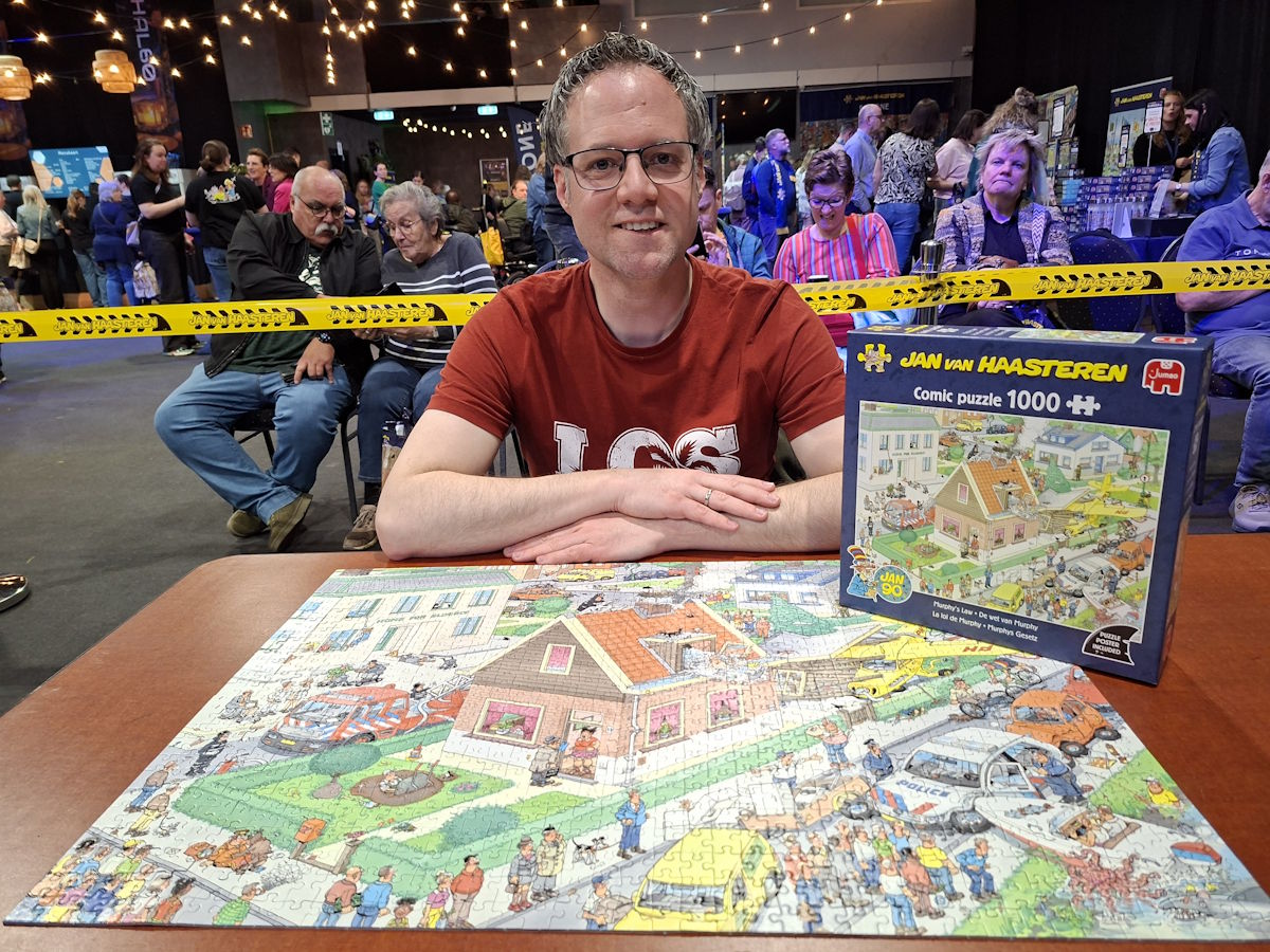 Dit jaar kregen de duo’s een reguliere Jan van Haasteren puzzel en de teams een puzzel uit de oldtimer reeks. De titel van onze puzzel was De wet van Murphy. Een puzzel van 1000 stukjes waarin, zoals de titel al doet vermoeden, van alles misgaat.