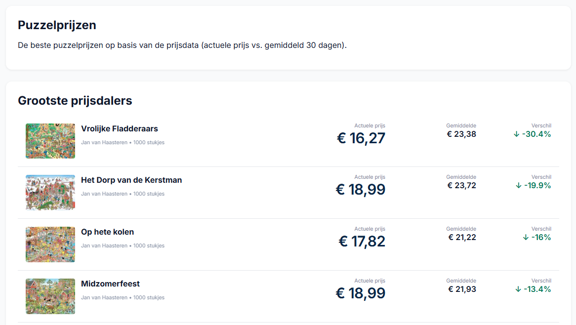 Er is nu een aparte pagina met puzzelprijzen waarop de acht grootste prijsdalers overzichtelijk bij elkaar staan. Op deze pagina wordt de actuele prijs per puzzel vergeleken met het gemiddelde van de afgelopen 30 dagen. Daardoor is direct zichtbaar of een puzzel op dit moment relatief laag geprijsd is. Het verschil en percentage worden per puzzel getoond, zodat snel duidelijk wordt welke puzzels nu extra interessant zijn.