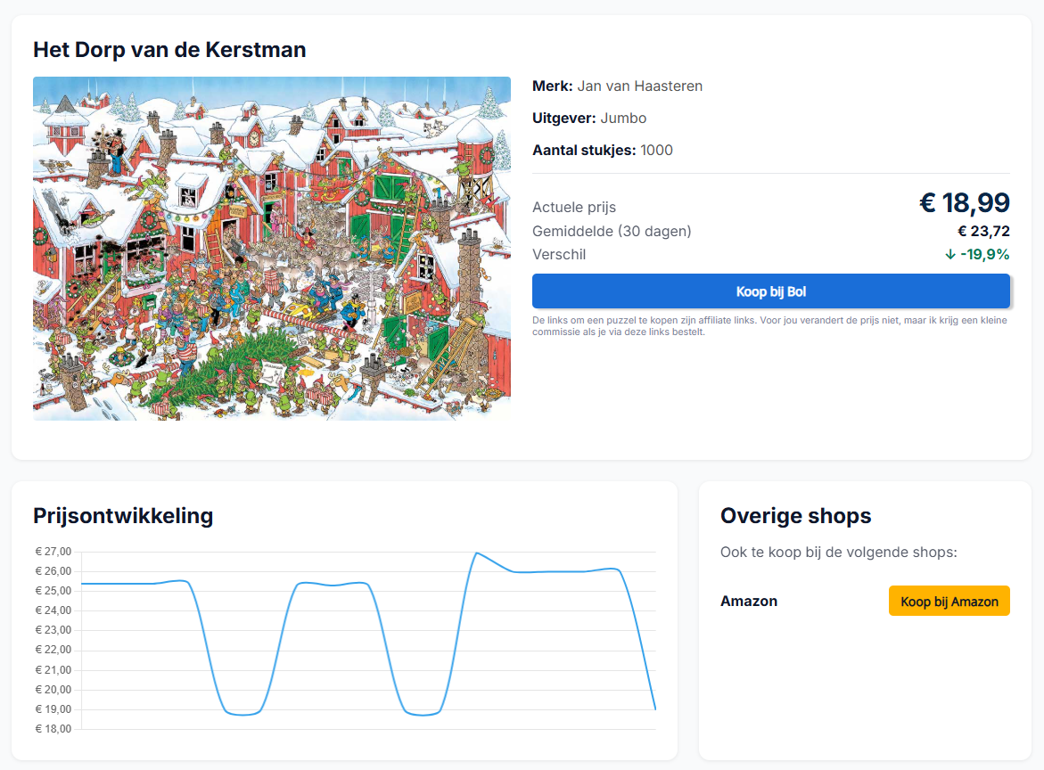 Om deze functionaliteit te kunnen realiseren heeft het schrijven van nieuwe artikelen de afgelopen periode minder focus gekregen. De aandacht is vooral gegaan naar het verzamelen, verwerken en tonen van prijsinformatie, zodat de prijs- en dealpagina’s nu echt bruikbaar zijn als praktische hulp bij het kiezen en kopen van puzzels.