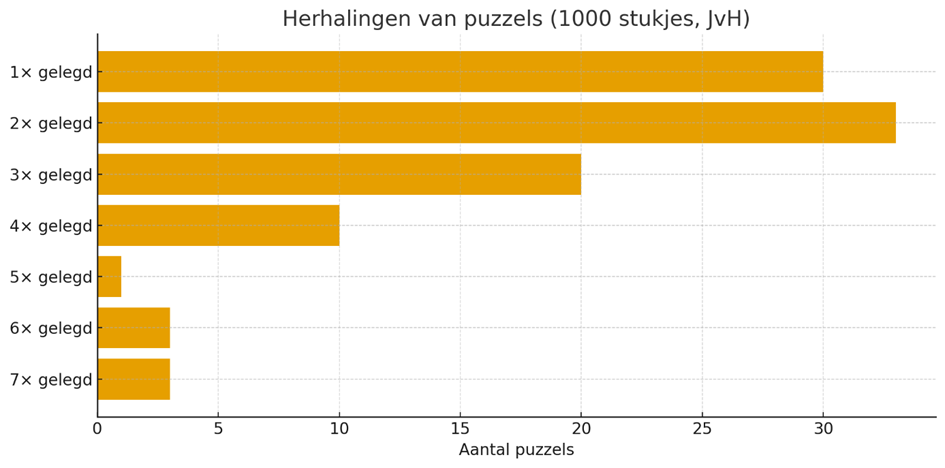 We merken zelf dat we sommige puzzels graag opnieuw leggen. Dat zie je ook duidelijk terug in de data: een deel van de puzzels komt maar één keer voor, maar veel puzzels leggen we twee of drie keer, en een paar zelfs nog veel vaker. In de grafiek hieronder zie je hoe vaak onze puzzels zijn herhaald. De grootste groep bestaat uit puzzels die één of twee keer zijn gelegd, gevolgd door enkele echte favorieten die we drie keer of vaker hebben gemaakt.