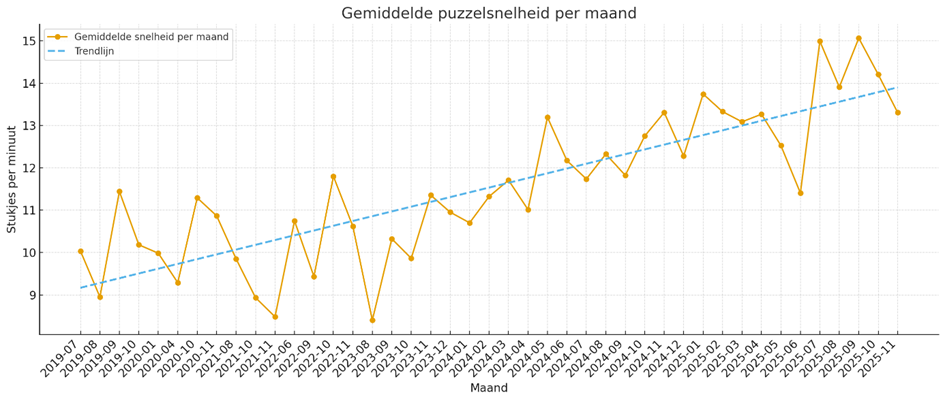 De grafiek hieronder laat zien hoe onze puzzelsnelheid zich ontwikkelt wanneer het herhaalvoordeel volledig wordt verwijderd. Door elke poging terug te rekenen naar het niveau van een eerste poging, blijft alleen onze echte puzzelvaardigheid over. Zelfs zonder herhalingswinst blijft een duidelijke stijgende lijn zichtbaar. Nieuwe puzzels leggen we tegenwoordig sneller dan in eerdere jaren, waarbij recente maanden waarden rond de 11 tot 12 stukjes per minuut laten zien.