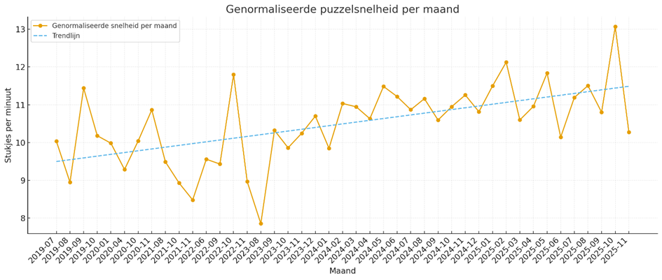 Uit de volledige analyse blijkt duidelijk dat onze puzzelsnelheid de afgelopen jaren merkbaar is toegenomen. Ook wanneer het herhaalvoordeel volledig wordt weggehaald, laat de genormaliseerde trendlijn zien dat onze basisvaardigheid blijft stijgen. Nieuwe puzzels leggen we tegenwoordig op een tempo dat we in eerdere jaren niet haalden, en bij herhaalde puzzels worden we niet alleen sneller door herkenning, maar ook efficiënter in aanpak en samenwerking.